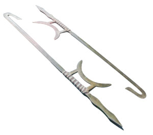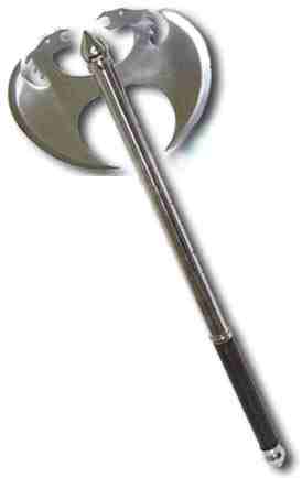 War Hammer:(IMG: http://www.fisk-knives.com/War_Hammer3.jpg) A war hammer is an archaic weapon of war intended for close combat, the design of which resembles the hammer. The war hammer consists, like the tool it resembles, of a handle and a head. The handle may be of different lengths, the longest being roughly equivalent to the halberd, and the shortest about the same as a mace. Long warhammers were pole weapons meant for use against riders, whereas short ones were used in closer quarters and from horseback. Later warhammers often had a spike on one side of the head, thus making it a more versatile weapon. Warhammers were developed as a consequence of the ever more prevalent metal armours of the medieval battlefields during the 14th and 15th centuries. The war hammer could deal blows of tremendous force to the target, especially when mounted on a pole, and by impact alone do damage without penetrating the armour. The spike end could be used for grappling the target's armour, reins, or shield, or could be turned in the direction of the blow to pierce even heavy armour. Against mounted opponents the weapon could also be directed at the legs of the horse, toppling the armored foe to the ground where they could be dealt with. Cross-bow/ Arbalest(IMG: http://www.hermitagemuseum.org/iedu_En/tk/graphics/tkz32131.jpg) The arbalest was a late variation of the crossbow. It was much larger and the actual "bow" part was made of steel. A good crossbowman could shoot two bolts per minute. Since an arbalest was much larger than earlier crossbows, it had a greater force. Arbalests were nearly claimed inhumane and were abolished by the Pope since an inexperienced crossbowman could kill a knight with a lifetime of training. Battle Axe:(IMG: http://www.weaponscentral.net/medievel/Double%20Dragon.jpg) The battle axe is a weapon used to cleave skulls and or decapitate, depending on whether it is a 1 handed or 2 handed one, weighs an average of 25 lbs. Their users, due to the movements required to wield, often build up abnormally large muscles in their shoulder on the side used. Not to be confused with the hatchet, the battle axe usually has a blade around two feet long. Double Bladed Sword:(IMG: http://www.destinyone.com/echelon14/2003_1015_052648AAX.jpg) (IMG: http://www.destinyone.com/echelon14/2003_1015_052725AAX.jpg) Hook Swords:(IMG: http://www.usawushu.com/shop/weapons/big/DoubleHooks.jpg) The Double Hooks (sometimes called �Tiger Hooks� or �Tiger Head Hook Swords�) are traditional Northern kung fu weapons that have been gaining in popularity. Not only are they granted great distinction because of their outlandish � though distinctly attractive � appearance, but also because of their great inventiveness and utility. Unlike other weapons, most of which have only one or two striking surfaces, the Double Hooks can be used at a variety of ranges in a multitude of ways. The dagger-blades and the crescent moon guards can be used for slashing and stabbing at close range. The blades and hooks can cut, penetrate, and even catch enemy weapons (or the enemy) at medium range. And the swords can be hooked together and lashed out for great, sweeping cuts at long range.